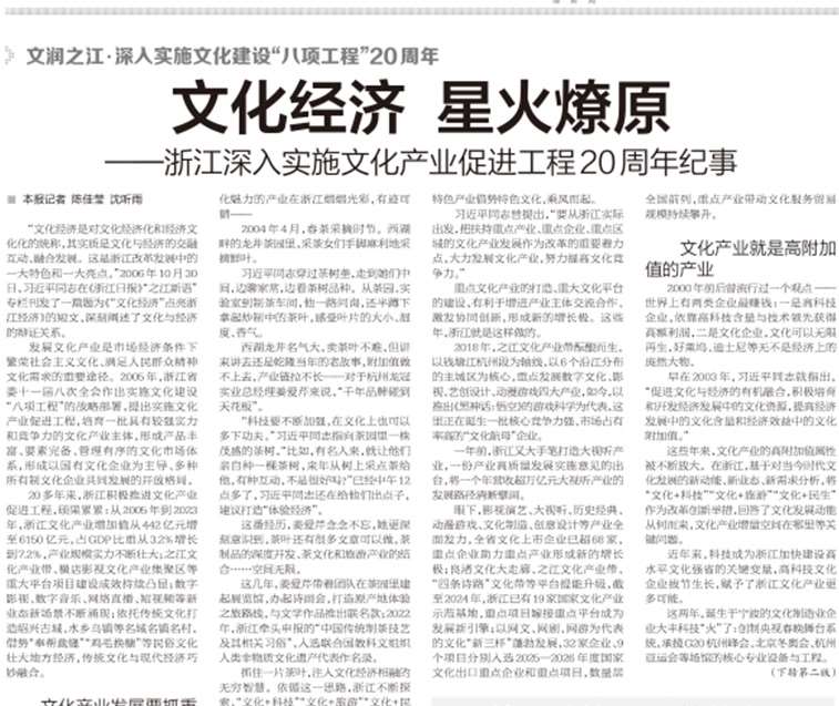 【浙江日报】文化经济 星火燎原 ——浙江深入实施文化产业促进工程20周年纪事