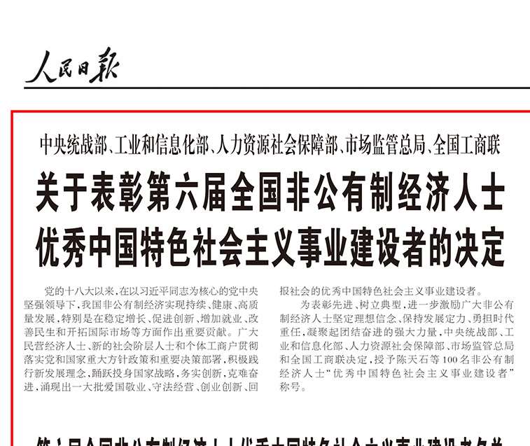 【人民日报】 中央统战部,工业和信息化部,人力资源社会保障部,市场监管总局、全国工商联关于表彰第六届全国非公有制经济人士优秀中国特色社会主义事业建设者的决定
